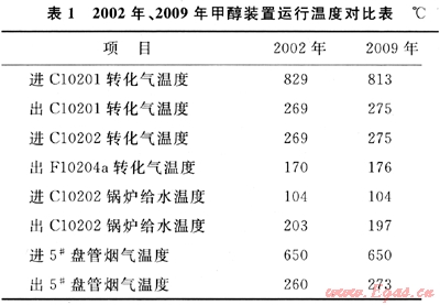 2002年(蒸汽系統(tǒng)能自平衡)、2009年(進轉(zhuǎn)化爐對流段5#盤管煙氣溫度650℃)甲醇裝置運行參數(shù)如表1所示。