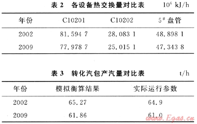 比較表3中轉(zhuǎn)化汽包模擬產(chǎn)汽量和實際產(chǎn)汽量,可判斷:C10201、C10202、5#盤管以及相應(yīng)的管道存在一定的熱損失,且2009年的熱損失明顯高于2002年,這是設(shè)備、管道的保溫效率下降所導(dǎo)致的。