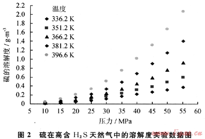 1) 測定了溫度336.2~396.6K、壓力10.0~55.2MPa范圍內硫在高含H2S天然氣中的溶解度為0.0083~2.O672g/m3。