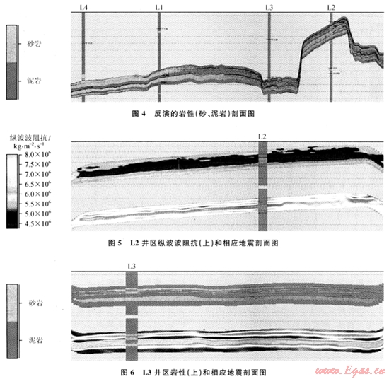 對(duì)比圖1~4,可以看出疊前隨機(jī)反演結(jié)果的垂直分辨率較疊前AVA同步反演結(jié)果有很大提高,地震資料無法分辨的L2井區(qū)的兩套薄砂層(圖5)和L3井區(qū)的砂泥互層(圖6)在反演結(jié)果中均表現(xiàn)十分清楚。該氣組儲(chǔ)層是低水位期在內(nèi)陸架環(huán)境中形成的近源風(fēng)暴席狀沙沉積,分布較穩(wěn)定。而反演結(jié)果中儲(chǔ)層橫向連續(xù)性也很好,符合該區(qū)的沉積相分布特征;同時(shí)上下層位的接觸關(guān)系與原始地震資料也吻合很好,進(jìn)一步驗(yàn)證了預(yù)測的可靠性。反演成果在該氣田的開發(fā)井設(shè)計(jì)優(yōu)化中得到了實(shí)際應(yīng)用,并為今后的氣田開發(fā)實(shí)施提供了有力的資料,有利于降低開發(fā)風(fēng)險(xiǎn)、提高效率。