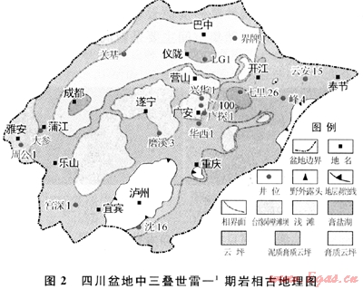 1) 中三疊世雷口坡期四川盆地為障壁蒸發(fā)漏湖沉積,由雷一-雷四期,膏鹽湖中心從川中南充地區(qū),逐漸擴(kuò)大至簡(jiǎn)陽(yáng),最后遷移至鹽亭蒲西地區(qū),圍繞膏鹽湖分布白云巖坪及顆粒灘。