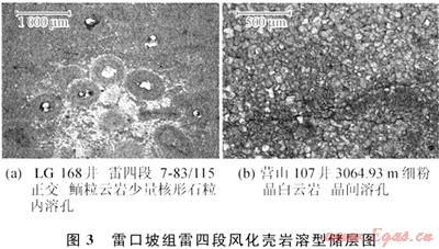 發(fā)育風(fēng)化殼巖溶型白云巖和顆粒白云巖2類(lèi)儲(chǔ)層,前者見(jiàn)于盆地中部地區(qū),以LG雷四段為代表;后者發(fā)育于雷一段和雷三段,以中壩氣田最為典型[17],下面分別討論其特點(diǎn)。