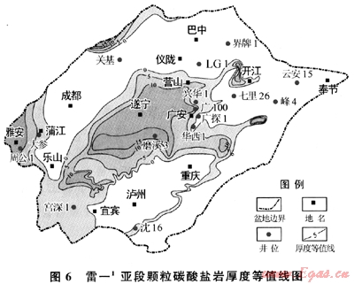 綜上所述,上述2套儲(chǔ)層的發(fā)育條件和區(qū)域分布不同,風(fēng)化殼型巖溶儲(chǔ)層受微相和巖溶作用的控制,縱向上分布在風(fēng)化殼下數(shù)十米范圍內(nèi),平面上分布于有利巖相和有利巖溶古地貌單元疊合部位,初步預(yù)測(cè)LG-營(yíng)山-西充-遂寧是勘探有利區(qū),勘探面積約2×104km2;顆粒白云巖儲(chǔ)層主要受微相控制,雷一顆粒灘分布于川中磨溪-廣安地區(qū),面積約1×104km2;雷三顆粒灘分布于龍門(mén)山前帶,面積約8000km2。