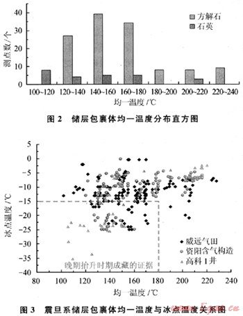 從威遠(yuǎn)、資陽(yáng)地區(qū)震旦系儲(chǔ)層以方解石為宿主礦物的包裹體均一溫度分布看,均一溫度分布在120~180℃的占絕對(duì)優(yōu)勢(shì),同時(shí)也檢測(cè)到大于180℃的高溫包裹體(圖2)。而從均一溫度與冰點(diǎn)溫度的相關(guān)關(guān)系(圖3)分析,均一溫度分布在120~180℃的包裹體,其冰點(diǎn)溫度有很大的差異,這實(shí)際上反映了兩期烴類的充注,即印支期液態(tài)烴類的充注(低溫高冰點(diǎn))和晚期地層抬升剝蝕過(guò)程中氣態(tài)烴類的充注(低溫低冰點(diǎn))。大于180℃的高溫包裹體主要反映了地質(zhì)歷史時(shí)期中地層深埋、液態(tài)烴類發(fā)生裂解的燕山期。石英礦物中所檢測(cè)到的包裹體數(shù)量雖然不多,但其均一溫度分布范圍大,從102~206℃。
