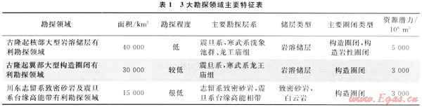 以上分析表明,四川盆地震旦系-下古生界具有有利的油氣成藏條件,資源潛力大,但勘探程度仍然很低,勘探前景廣闊。從勘探程度及研究、認(rèn)識(shí)程度綜合分析,主要有3大勘探領(lǐng)域,即古隆起核部大型巖溶風(fēng)化殼勘探領(lǐng)域、古隆起翼部大型構(gòu)造圈閉勘探領(lǐng)域和川東志留系致密砂巖及震旦系臺(tái)緣高能帶勘探領(lǐng)域,各領(lǐng)域的主要特征見表1。