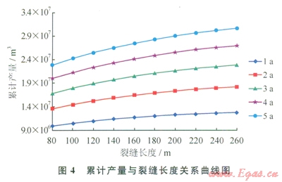 通過(guò)模擬不同縫網(wǎng)長(zhǎng)度下的壓裂井產(chǎn)能,并分析凈現(xiàn)值與縫網(wǎng)長(zhǎng)度的關(guān)系,其模擬結(jié)果如圖4、5所示。隨著裂縫長(zhǎng)度的增加,累計(jì)產(chǎn)量與凈現(xiàn)值在200~220m均出現(xiàn)拐點(diǎn)。因此優(yōu)選的縫網(wǎng)長(zhǎng)度為200~220m,此長(zhǎng)度下地質(zhì)模型中的改造體積為128×104m3。