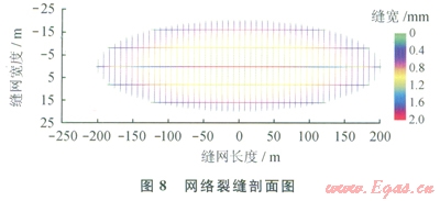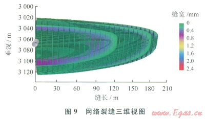 以優(yōu)化得到的高滲透帶長(zhǎng)度、滲透率為目標(biāo),借助頁(yè)巖壓裂設(shè)計(jì)軟件對(duì)不同液量、不同砂量下的壓裂網(wǎng)絡(luò)裂縫參數(shù)進(jìn)行模擬。模擬發(fā)現(xiàn):改造體積與液量成正相關(guān)關(guān)系,縫網(wǎng)長(zhǎng)度與前置液成正相關(guān)關(guān)系,它們均與砂量無(wú)關(guān),給定液量下裂縫導(dǎo)流能力與加砂量成正相關(guān)關(guān)系。最終在總液量為l600m3、總砂量為53m3下得到縫長(zhǎng)202m,改造體積102×104m3 (其小于地質(zhì)模型中改造體積的原因在于模擬得到的裂縫網(wǎng)絡(luò)為橢球形,而地質(zhì)模型中的等效高滲透帶為長(zhǎng)方體,后續(xù)研究中將對(duì)地質(zhì)模型進(jìn)一步改進(jìn)),縫網(wǎng)平均導(dǎo)流能力為0.039D·cm,平均縫網(wǎng)寬度為0.37mm,結(jié)合縫網(wǎng)參數(shù)計(jì)算得到等效滲透率為4.49mD,滿足設(shè)計(jì)要求。模擬得到的網(wǎng)絡(luò)裂縫參數(shù)如下:裂縫網(wǎng)絡(luò)長(zhǎng)404m,裂縫網(wǎng)絡(luò)寬40m,裂縫網(wǎng)絡(luò)高92m,平均DFN寬度為0.37mm,改造體積(SRV)1025500m3,DFN體積為43lm3,DFN平均導(dǎo)流能力為0.0397D·cm,等效滲透率為4.49mD。網(wǎng)絡(luò)裂縫形態(tài)如圖8、9所示。
