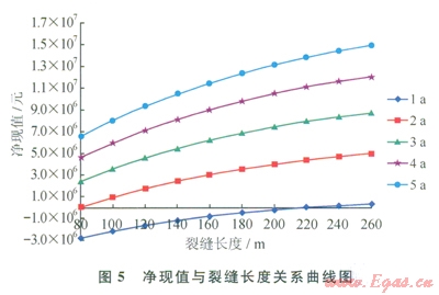 結(jié)合經(jīng)濟(jì)評(píng)價(jià)模型,通過(guò)模擬高滲透帶長(zhǎng)度為80~260m下的產(chǎn)量,利用凈現(xiàn)值法優(yōu)選裂縫長(zhǎng)度,凈現(xiàn)值表達(dá)式為: