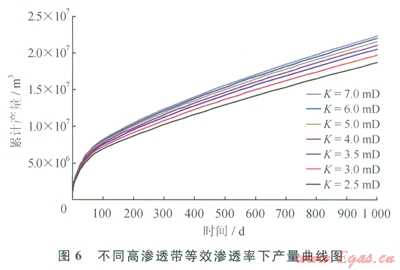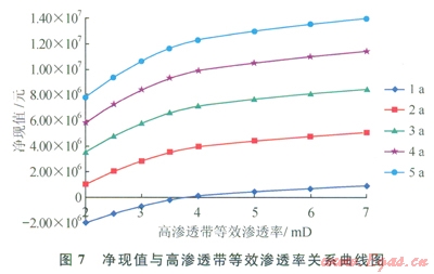 改變地質(zhì)模型中高滲透帶滲透率,模擬高滲透帶滲透率分別為2.5、3.0、3.5、4.0、5.0、6.0、7.0mD時(shí)的產(chǎn)量,分析凈現(xiàn)值與高滲透帶等效滲透率的關(guān)系,其模擬結(jié)果見(jiàn)圖6、7。隨著高滲透帶滲透率的增加產(chǎn)量不斷增加,當(dāng)高滲透帶等效滲透率增加到4mD后,產(chǎn)量增幅及凈現(xiàn)值曲線均趨于平穩(wěn),因此優(yōu)選的高滲透帶滲透率為4~5mD。