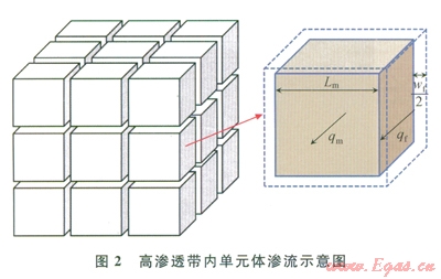 高滲透帶滲流單元由基質(zhì)及其附近的裂縫空間組成如圖2所示。其中基質(zhì)內(nèi)的滲流可表示為: