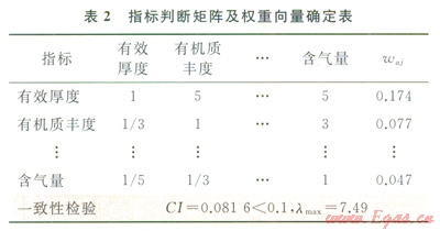 根據(jù)前述選取的指標(biāo)體系,通過(guò)調(diào)查專家意見,并參考專家以前在頁(yè)巖氣選區(qū)時(shí)賦予指標(biāo)不同的權(quán)重值,計(jì)算了各個(gè)指標(biāo)的權(quán)重。建立指標(biāo)兩兩判斷矩陣,計(jì)算最大特征值并檢驗(yàn)判斷矩陣的一致性(表2)。驗(yàn)證結(jié)果表明:矩陣具有滿意的一致性,層次分析法得到的指標(biāo)權(quán)重為:waj=(0.174,0.077,0.105,0.313,0.206,0.079,0.047).