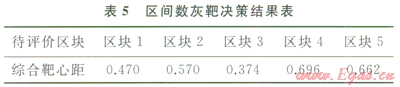 投影長(zhǎng)度(xij*)記為綜合靶心距。綜合靶心距計(jì)算結(jié)果如表5所示。由區(qū)間數(shù)灰靶決策模型得到的結(jié)果為:x*=min(xij*)=0.374。該結(jié)果對(duì)應(yīng)的足區(qū)塊3。因此,區(qū)塊3為資源勘探開發(fā)潛力評(píng)價(jià)最優(yōu)區(qū)塊。