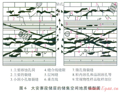 圖6為綜合上述各項(xiàng)儲(chǔ)集空間特征的儲(chǔ)層地質(zhì)模型[19],從中不難確定,對(duì)大安寨段儲(chǔ)層貢獻(xiàn)最大的無疑是各類裂縫及沿裂縫溶蝕形成的各類溶縫、溶孔和溶洞,其次為晶間孔,溶蝕微孔和微縫雖然很小,但數(shù)量眾多,其貢獻(xiàn)也不容忽視。