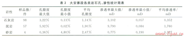 大安寨段主體以石灰?guī)r和頁(yè)巖為主,部分為過渡類型的泥質(zhì)灰?guī)r和鈣質(zhì)泥巖,少量為粉一細(xì)粒砂巖。從孔、滲性統(tǒng)計(jì)結(jié)果(表2),可以看出,大安寨段砂巖的平均孔隙度相對(duì)較高,為2.47%,但滲透率最低為0.327mD,石灰?guī)r孔隙度和滲透率都為最低,平均值分別為1.14%和0.352mD,而泥頁(yè)巖的平均孔隙度居中,為1.9%,平均滲透率則高達(dá)l.76mD。由此可以看出,大安寨段中最有利儲(chǔ)層發(fā)育的巖性并非為石灰?guī)r和砂巖,近期的勘探實(shí)踐也證明了大安寨段儲(chǔ)層的發(fā)育特征,表現(xiàn)出有悖于常規(guī)石油地質(zhì)理論的3大特點(diǎn):①介殼灰?guī)r的物性有隨石灰?guī)r中泥質(zhì)含量增加,孔隙度雖然變化不大,而滲透率卻趨于上升的特點(diǎn),原因可能在于介殼灰?guī)r中的泥質(zhì)在成巖過程中具有收縮作用,有利于粒緣和粒間成巖收縮縫的發(fā)育;②大安寨段儲(chǔ)層并非為單一巖石類型,而是各類石灰?guī)r,特別是泥質(zhì)介殼灰?guī)r與碳質(zhì)頁(yè)巖的不等厚互層組合體,無論是在剖面上還是平面上(圖2、3),都位于偏向半深湖一側(cè)的介殼灘灘緣和湖坡帶,具有較穩(wěn)定的層位和較大分布范圍;③介殼灰?guī)r與碳質(zhì)頁(yè)巖互層組合體中,滲透率隨著頁(yè)巖夾層增多加厚而趨于降低,說明組合體中頁(yè)巖夾層過多也不利于儲(chǔ)層發(fā)育。