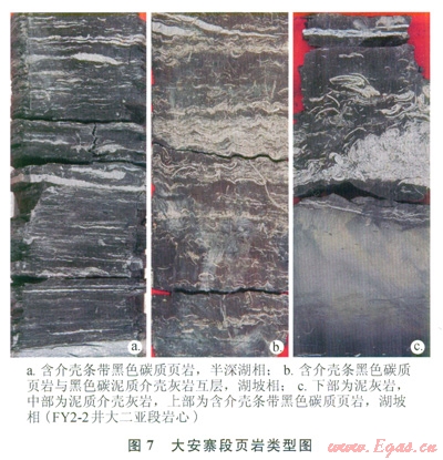 大安寨段頁(yè)巖類型豐富,而具備成藏條件的頁(yè)巖主體為半深湖—湖坡相的薄層狀暗色碳質(zhì)頁(yè)巖,頁(yè)巖中往往含介殼條帶或夾有薄層狀黑色碳泥質(zhì)介殼灰?guī)r(圖7),而淺湖、濱湖相的灰色和雜色頁(yè)巖、粉砂質(zhì)頁(yè)巖、鈣質(zhì)頁(yè)巖等不具備頁(yè)巖氣成藏條件。碳質(zhì)頁(yè)巖厚度對(duì)頁(yè)巖氣的勘探開發(fā)具有重要意義,特點(diǎn)為:①大一亞段碳質(zhì)頁(yè)巖主要出現(xiàn)在下部,為與薄層碳泥質(zhì)介殼灰?guī)r互層組合,碳質(zhì)頁(yè)巖的累計(jì)厚度為8~12m;②大二亞段由大套碳質(zhì)頁(yè)巖夾泥質(zhì)介殼灰?guī)r條帶或薄層組成,單層頁(yè)巖的厚度一般不超過2m,累計(jì)厚度為30~50m;③大三亞段碳質(zhì)頁(yè)巖出現(xiàn)在上部,也為與薄層碳泥質(zhì)介殼灰?guī)r互層組合,碳質(zhì)頁(yè)巖的累計(jì)厚度很小,僅為2~5m。需指出的是,大安寨段碳質(zhì)頁(yè)巖的發(fā)育不僅具有從大三亞段上部經(jīng)大二亞段至大一亞段下部的連續(xù)沉積特點(diǎn)(圖2),而且40~60m的總累計(jì)厚度在湖坡和半深湖亞相區(qū)(圖3、4)范圍內(nèi)的分布非常穩(wěn)定,對(duì)照美國(guó)密執(zhí)安盆地Antrim頁(yè)巖氣藏最小頁(yè)巖厚度僅為9.1m,特沃斯盆地Barnett頁(yè)巖氣藏30.5m的頁(yè)巖厚度已被證明具有商業(yè)開采價(jià)值的現(xiàn)狀[21],該區(qū)大安寨碳質(zhì)頁(yè)巖的厚度已完全具備形成頁(yè)巖氣藏的條件。