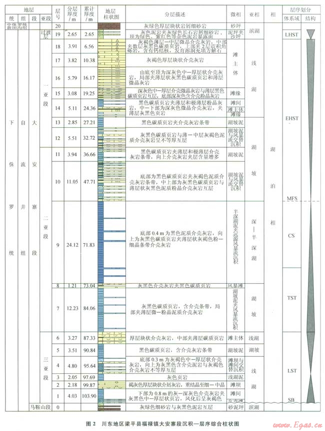 1)川東地區(qū)大安寨段為淡水湖泊沉積體系,發(fā)育濱湖、淺湖、湖坡和深—半深湖4種亞相,對(duì)應(yīng)完整的湖侵湖退旋回過程,可劃分為低位、湖侵、早期高位和晚期高位4個(gè)沉積體系域。