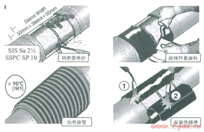 三層結構熱縮帶的施工比較麻煩,在安裝熱縮帶之前要對鋼表面進行噴砂處理,之后涂抹環(huán)氧涂料并對節(jié)點表面的涂料進行加熱以使其迅速固化。由于工作環(huán)境的特殊性,海管節(jié)點的噴砂和加熱必須使用專用的設備。為了不大幅延長工作時間,三層結構熱縮帶的安裝至少要占用鋪管作業(yè)線的兩個站點,施工人員十個左右。