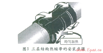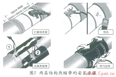 兩層結構熱縮帶施工簡單,只需要對海管節(jié)點裸鋼表面進行打磨、預熱就可以安裝熱縮帶了。安裝過程只需要將熱縮帶纏繞在節(jié)點上,按要求均勻加熱,熱縮帶就會收縮,緊緊的固定在節(jié)點鋼表面上。一般只需要占用鋪管作業(yè)線的一個站點,兩個人用五分鐘左右就可以完成一個節(jié)點的防腐施工。