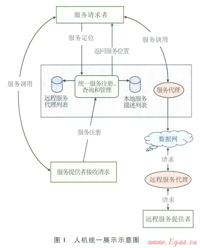 人機(jī)界面中的應(yīng)用以插件方式集成到系統(tǒng)中,控制臺(tái)負(fù)責(zé)實(shí)現(xiàn)界面集成管理功能。人機(jī)應(yīng)用通過服務(wù)接口層的服務(wù)代理與后臺(tái)服務(wù)進(jìn)行交互,服務(wù)代理提供了訪問后臺(tái)服務(wù)的接口,其主要功能是接收人機(jī)應(yīng)用的服務(wù)請求并將請求通過服務(wù)總線發(fā)送給后臺(tái)服務(wù),然后接收服務(wù)應(yīng)答并返凹給人機(jī)應(yīng)用。服務(wù)代理屏蔽了訪問服務(wù)的細(xì)節(jié),使應(yīng)用元需關(guān)心服務(wù)的具體部署信息以及訪問過程,因此有很好的服務(wù)訪問透明性。