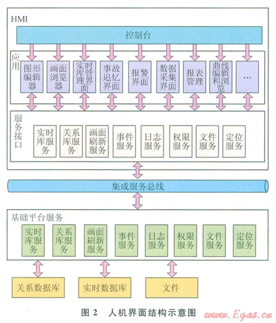 3)服務(wù)接口層提供了各類應(yīng)用與后臺(tái)服務(wù)交互的接口,主要包括實(shí)時(shí)庫接口、關(guān)系庫接畫面刷新服務(wù)接口、事件服務(wù)接口、權(quán)限服務(wù)接口、文件服務(wù)接口等。服務(wù)接口層實(shí)現(xiàn)了應(yīng)用對服務(wù)的透明性訪問。