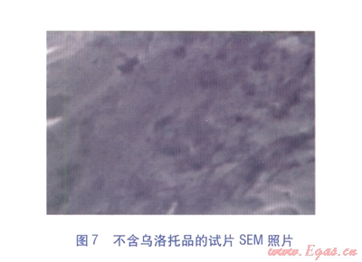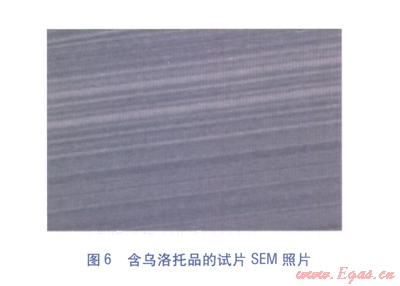 當(dāng)旋轉(zhuǎn)掛片腐蝕實(shí)驗(yàn)結(jié)束后,從溶液中取出金屬碳鋼掛片,對(duì)試片分別清洗后粘在貼有雙面膠的試樣臺(tái)上。為了保證試片表面各處都能夠均勻?qū)щ?,避免因電荷積累造成尖端放電而影響成像質(zhì)量,測(cè)試前要對(duì)試片進(jìn)行噴金(Au)處理。噴金后置于KYKY28008型掃描電子顯微鏡下觀察,加速電壓為15kV,放大倍數(shù)為5000。觀察結(jié)果表明,含緩蝕劑烏洛托品的5%羥基亞乙基二膦酸清洗劑中,碳鋼試片的腐蝕痕跡不明顯,顯示出較完整的基材表面,見圖6;不含緩蝕劑的清洗劑中金屬碳鋼試片表面出現(xiàn)了一定的坑狀腐蝕,試片表面稍微粗糙,見圖7。