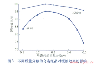 在質(zhì)量分?jǐn)?shù)為5%的羥基亞乙基二膦酸清洗溶液中,分別加入不同質(zhì)量分?jǐn)?shù)的烏洛托品緩蝕劑,然后按照3.3.1方法分別測(cè)定不銹鋼及碳鋼標(biāo)準(zhǔn)試片的腐蝕速率,由此計(jì)算出烏洛托品緩蝕劑對(duì)金屬不銹鋼及碳鋼的緩蝕效率,實(shí)驗(yàn)結(jié)果見圖3。