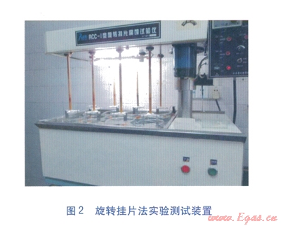 參照GB/T l8175—2000《水處理劑緩蝕性能的測(cè)定——旋轉(zhuǎn)掛片法》規(guī)定的方法,按公式(1)及公式(2)分別計(jì)算金屬的腐蝕速率及緩蝕劑的緩蝕效率。旋轉(zhuǎn)掛片法的實(shí)驗(yàn)測(cè)試裝置見圖2。