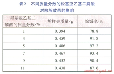 實(shí)驗(yàn)方法采用失重法,具體方法步驟如下:用孔徑8mm的篩子篩選顆粒均勻的大理石(CaCO3)作為垢樣,使用BT224S型電子分析天平準(zhǔn)確稱量0.5g垢樣數(shù)組,分別放入盛有100mL不同羥基亞乙基二膦酸質(zhì)量分?jǐn)?shù)的清洗液的試管中,在溫度為30℃的501BS型恒溫水浴鍋中靜置10h后,用布氏漏斗進(jìn)行真空抽濾,將殘余的垢樣放入768-3型遠(yuǎn)紅外干燥箱中在50℃下烘干至恒重,最后放入玻璃下燥器中冷卻至室溫后于BT224S型電子分析天平上再次稱重。根據(jù)公式(3)計(jì)算清洗劑的除垢率并將實(shí)驗(yàn)結(jié)果列于表2。