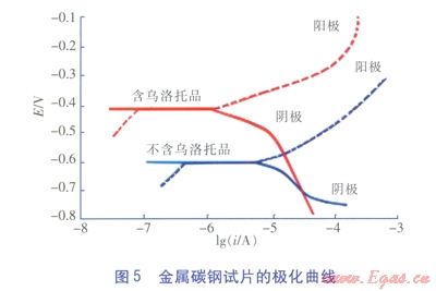 由圖5可以看出:在其他條件相同的情況下,碳鋼試片在含烏洛托品緩蝕劑的清洗液中與不含烏洛托品緩蝕劑的清洗液中相比,腐蝕電位明顯正移,說(shuō)明在含烏洛托品緩蝕劑的清洗液中的試片更不易腐蝕,烏洛托品是一種能夠抑制陽(yáng)極極化的緩蝕劑,在清洗過程中可以防止金屬的腐蝕。