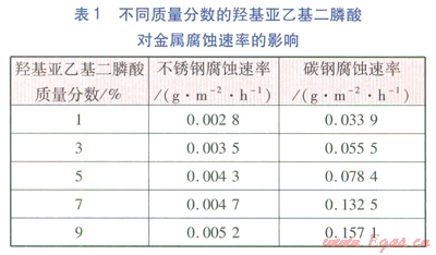 由表l可見,隨著羥基亞乙基二膦酸的質(zhì)量分?jǐn)?shù)逐漸增加,不銹鋼的腐蝕速率增大的幅度比較平緩,說(shuō)明影響不太明顯;對(duì)碳鋼的腐蝕速率影響比較大,特別是當(dāng)羥基亞乙基二膦酸的質(zhì)量分?jǐn)?shù)超過5%以后,碳鋼的腐蝕速率增長(zhǎng)幅度非常明顯,當(dāng)質(zhì)量分?jǐn)?shù)達(dá)到9%時(shí)與5%時(shí)相比增長(zhǎng)近一倍。因此,實(shí)際清洗時(shí)把清洗主劑羥基亞乙基二膦酸的質(zhì)量分?jǐn)?shù)控制在5%較為合適。