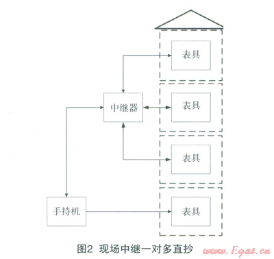 本方式在現(xiàn)場(chǎng)直抄方式上進(jìn)一步結(jié)合中繼,實(shí)現(xiàn)更大范同的點(diǎn)對(duì)點(diǎn)抄表。