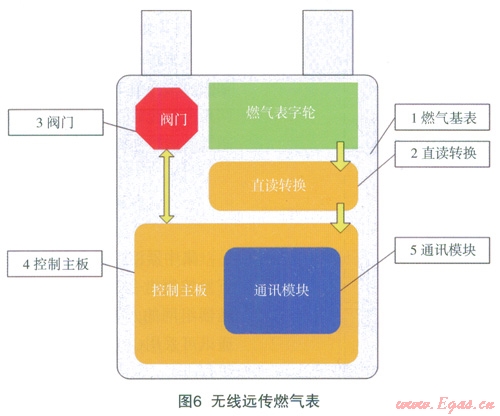 無(wú)線遠(yuǎn)傳燃?xì)獗硎窃谄胀矣闷つと細(xì)獗砩霞友b光電直讀計(jì)數(shù)器、電子控制模塊、無(wú)線通訊模塊等電子模塊組成的,如圖6所示,無(wú)線遠(yuǎn)傳燃?xì)獗戆惭b在用戶家中,燃?xì)夤疽詿o(wú)線手持機(jī)或者采集器為無(wú)線數(shù)據(jù)傳輸媒介,對(duì)燃?xì)獗韺?shí)行戶外實(shí)時(shí)抄表和遠(yuǎn)程閥門(mén)控制。主要功能包括以下幾點(diǎn):