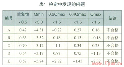 一批準確度等級為l.5級的腰輪流量計經(jīng)維修組裝完成后,沒有通過模擬運行工作臺跑活,送往檢測中心進行檢定,檢定結(jié)果顯示,其中5臺表具的重復(fù)性和點誤差數(shù)據(jù)不合格(表1)。