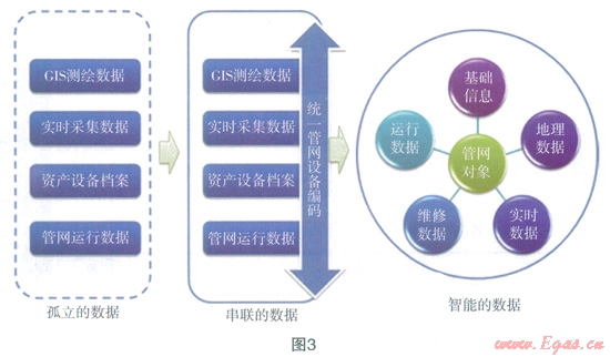 如何才能把不同種類的數據利用物理或者邏輯的方式集成起來?答案是通過統(tǒng)一的管網設備設施編碼,它同樣是智能燃氣網標準化建設體系里面的重要內容。北京燃氣集團從多年前就開始管網設備設施和物資體系的標準化工作,如存GIS地理信息系統(tǒng)里面就已經采用了l5位的統(tǒng)一管網編碼,但大部分業(yè)務系統(tǒng)設備設施的編碼體系還不完全一致,需要轉換或者對照才能把這些業(yè)務數據關聯(lián)起來。圖3足數據從串聯(lián)到完全關聯(lián)的過程。