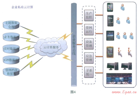 數據的集成最終是為了數據的有效利用和業(yè)務的集成,智能燃氣網企業(yè)私有云需要完成云計算PAAS層研發(fā)建設工作(IAAS層由于GIS數據和實時數據庫的相對獨立以及專業(yè)性,并不需要在硬件層面上完全虛擬化構建),為業(yè)務系統(tǒng)提供各類標準化計算與服務,如圖4所示。