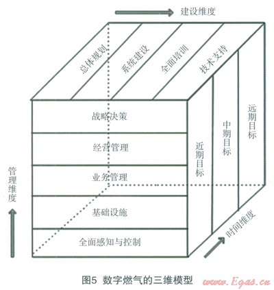 根據(jù)以上討論,我們可以按照管理、建設、時間三個維度來建立一個三維的數(shù)字燃氣建設模型,這樣可以形象地描述燃氣集團(公司)的數(shù)字燃氣建設的階段與狀態(tài),圖5所示。