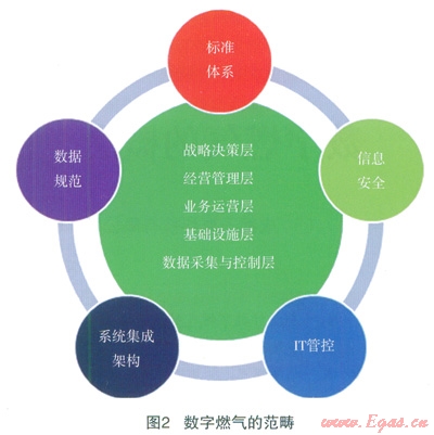 數(shù)字燃氣在軟件方面包含戰(zhàn)略決策層、經(jīng)營管理層、業(yè)務運營層三個層面的內(nèi)容,硬件方面包含基礎設施層、數(shù)據(jù)采取與控制層兩個層面。除此之外,我們認為數(shù)據(jù)燃氣還應當包括燃氣公司的數(shù)據(jù)規(guī)范的制定、技術標準體系的制定、信息安全管理、IT治理與管控,以及系統(tǒng)集成架構(gòu)的建設等內(nèi)容。圖2是數(shù)字燃氣范疇的示意圖。