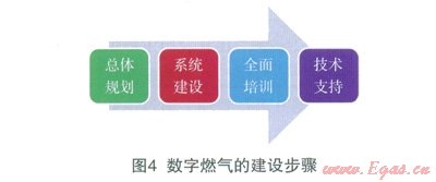 數(shù)字燃氣的建設應當采用先規(guī)劃后建設的行業(yè)先進模式,避免出現(xiàn)盲目建設、重復建設、信息孤島的問題。具體來說,應當先做總體規(guī)劃,在總體規(guī)劃指導下,進行應用系統(tǒng)建設,再做全面培訓,最后是技術支持。圖4是數(shù)字燃氣建設步驟的說明。
