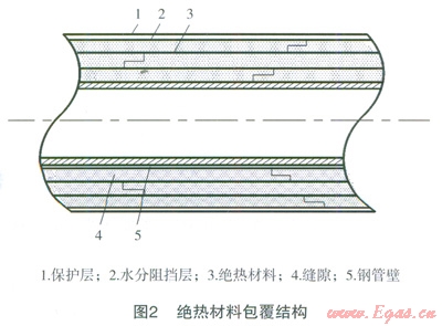 LNG槽車到站后,通常通過(guò)低溫泵法或增壓器法對(duì)槽車內(nèi)LNG增壓后將LNG卸入儲(chǔ)罐內(nèi)。不論采用哪種方法,LNG必須通過(guò)低溫管道進(jìn)行輸送,在輸送過(guò)程中,LNG將吸收外界環(huán)境熱量而氣化,產(chǎn)生BOG。為了減少BOG的產(chǎn)生,通常利用兩種方法對(duì)低溫管道進(jìn)行保冷處理,即絕熱材料包覆法和真空管法,這兩種方法結(jié)構(gòu)如圖2、3所示[5]。