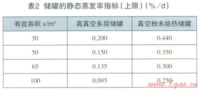 (2)設(shè)計(jì)文件應(yīng)對(duì)LNG儲(chǔ)罐提出明確的保冷指標(biāo)要求。不論是真空粉末絕熱儲(chǔ)罐還是高真空多層絕熱儲(chǔ)罐對(duì)保冷都應(yīng)有明確的要求,即某體積的儲(chǔ)罐都應(yīng)對(duì)應(yīng)相應(yīng)的真空度和靜態(tài)蒸發(fā)率,超過(guò)這些數(shù)值指標(biāo)就達(dá)不到保冷效果,蒸發(fā)氣體產(chǎn)生量就會(huì)增加,應(yīng)及時(shí)抽真空處理或采取其他措施。綜合相關(guān)規(guī)范和工程實(shí)踐,提出儲(chǔ)罐的保冷指標(biāo)要求,儲(chǔ)罐的封結(jié)真空度指標(biāo)要求見(jiàn)表1,靜態(tài)蒸發(fā)率指標(biāo)(上限)要求見(jiàn)表2。