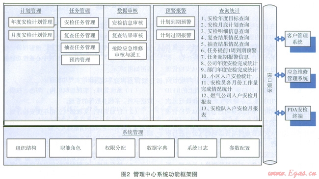 根據(jù)燃?xì)夤拘枨?,管理中心系統(tǒng)由系統(tǒng)管理、計劃管理、任務(wù)管理、數(shù)據(jù)審核管理、預(yù)警報價、查詢統(tǒng)計和接口服務(wù)等模塊構(gòu)成。管理中心系統(tǒng)功能框架圖如圖2所示。