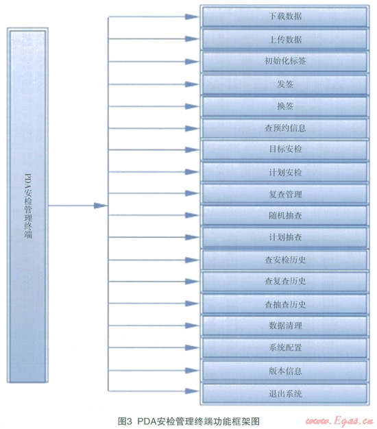 PDA安檢管理終端為安檢人員進行發(fā)簽、安檢、復(fù)查、換簽,以及安檢管理人員的安檢抽查提供現(xiàn)場操作手段。PDA安檢管理終端功能框架圖如圖3所示: