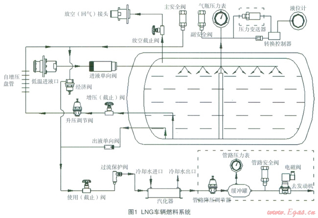 LNG車輛的燃料系統(tǒng)完全不同于柴油車,這是由LNG燃料本身的物理特性所決定的,LNG車燃料系統(tǒng)主要由LNG鋼瓶、汽化器、電磁閥、穩(wěn)壓閥、過濾器等構(gòu)成,部分設(shè)置緩沖罐;柴油車燃料系統(tǒng)主要由燃油箱、高壓油泵、油嘴、調(diào)速器,以及一些輔助裝置構(gòu)成。目前,車載LNG燃料系統(tǒng)由低溫設(shè)備供應(yīng)商直接供應(yīng)及提供售后服務(wù),常見的低溫設(shè)備供應(yīng)商包括查特、中集圣達因、張家港富瑞等。圖1為LNG車輛的燃料系統(tǒng)簡圖。