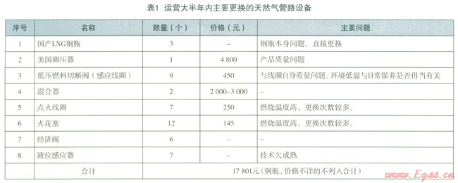 據(jù)大概統(tǒng)計,l00余臺LNG公交,投用大半年來,天然氣燃料系統(tǒng)更換的設(shè)備材料費用總共約2萬元(不包括LNG鋼瓶,鋼瓶本身問題),該部分費用均由天然氣燃料系統(tǒng)設(shè)備供應(yīng)商承擔(dān)(售后服務(wù)約定2年)。這些LNG車輛燃料系統(tǒng)出現(xiàn)問題較多的設(shè)備為低壓燃料切斷閥的感應(yīng)線圈、液位感應(yīng)器、點火線圈、火花塞等等。