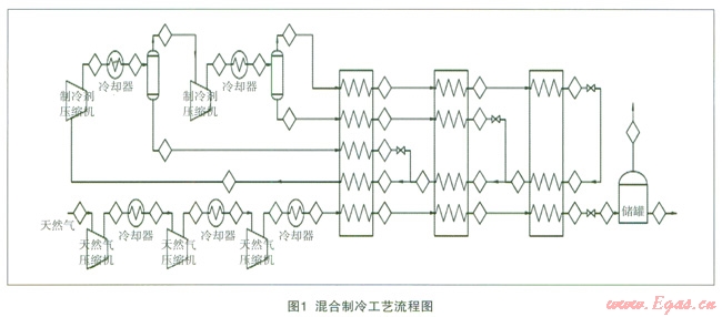 流程簡述:天然氣原料通過壓縮機一級壓縮并和循環(huán)水換熱,然后通過二級壓縮二次和循環(huán)水換熱,再經(jīng)過三級壓縮換熱進入換熱器(LNGl00)和制冷劑一次換熱,再經(jīng)換熱器(LNGl01)二次換熱,最后進入換熱器(LNGl02)換熱流入LNG大罐。另一路為制冷劑閉路循環(huán)從板翅式換熱器LNGl00復熱回來的制冷混合劑經(jīng)離心壓縮機一級壓縮換熱,流出分兩路,液體進入板翅式換熱器進行節(jié)流換熱。一路混合氣體再次經(jīng)二級壓縮換熱,分兩路氣體和液體氣體一路進入板翅式換熱器,二級壓縮分離出來的液體經(jīng)板翅式換熱器(LNGl00、LNGl00、LNGl00)換熱匯總到離心壓縮機進口。
