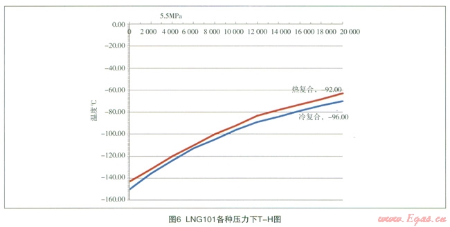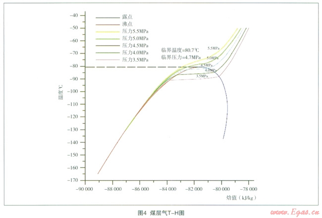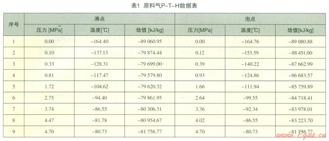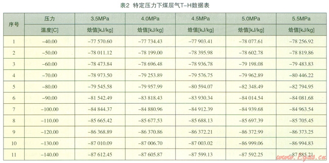 在特定壓力下,利用根據(jù)圖l建立的系統(tǒng)模型對煤層氣從初溫-40℃冷卻至-l40℃的過程中對煤層氣的T-H進行模擬計算,結果詳見表2。