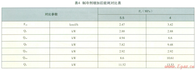 同時由圖4可以看出,隨著Pn的降低,原料氣的液化曲線不斷下移,而且愈加不平滑,由圖5~圖8可見換熱器(LNGl02)最小換熱溫差逐漸變小,當壓力降至4.0MPa時最小溫差變?yōu)樨撝?,換熱器(LNGl02)無法收斂。此外由于換熱溫差減小,導致LNG換熱器的UA值不斷增大。對于已建工廠,由于換熱器的體積一定,且換熱器內流體的流動狀態(tài)、各項物性參數(shù)也不會發(fā)生太大變化,因此其UA值也基本是一個定值,因此此時若不對制冷劑組分進行調整,則需增加制冷劑的循環(huán)量。在保證LNGl02換熱器UA基本不變的情況下增加制冷劑循環(huán)量處理每kmol原料氣的計算數(shù)據(jù)見表4。