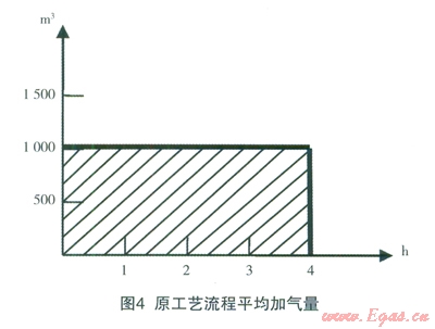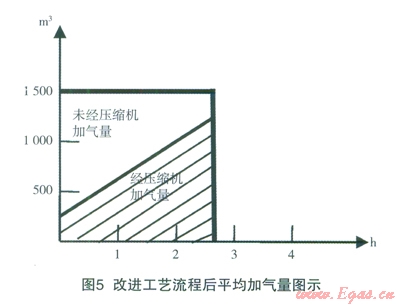 改進(jìn)工藝流程平均加氣量圖示:上部為管束氣瓶直接加入CNG汽車(chē)天然氣氣量,下部為經(jīng)壓縮機(jī)壓縮的加氣量;改進(jìn)工藝流程后加氣量由1000m3/h增加到1500m3/h;一輛管束車(chē)卸氣時(shí)間由原4h/車(chē)縮短到3h/車(chē)以?xún)?nèi);改進(jìn)工藝流程后相對(duì)減少了壓縮機(jī)開(kāi)機(jī)時(shí)間,減少了壓縮機(jī)的磨損并降低了能耗,實(shí)現(xiàn)了壓縮機(jī)在原有排氣量不變情況下提高加氣量的目的。