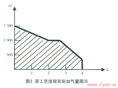 設(shè)CNG汽車(chē)車(chē)用氣瓶容積80L,20MPa壓力時(shí)總加氣l6m3;管束氣瓶壓力在18Mpa時(shí)可直接給CNG汽車(chē)加氣14m3,中、高壓系統(tǒng)補(bǔ)充加氣2m3;管束氣瓶壓力在10MPa時(shí)可直接給CNG汽車(chē)加氣8m3,中、高壓系統(tǒng)補(bǔ)充加氣8m3;管束氣瓶壓力在3Mpa時(shí)可直接給CNG汽車(chē)加氣2m3,中、高壓系統(tǒng)補(bǔ)充加氣l4m3;管束氣瓶加氣量與中高壓系統(tǒng)加氣量平均比值為l:1,考慮其它因素影響,管束氣瓶氣量與中高壓系統(tǒng)平均加氣比值調(diào)減為1:2,即新工藝流程三分之一氣量不通過(guò)壓縮機(jī),提高了CNG子站的加氣量約50%。當(dāng)壓縮機(jī)平均小時(shí)排氣量為l000m3時(shí),加氣量隨時(shí)間變化曲線見(jiàn)圖3、圖4、圖5。