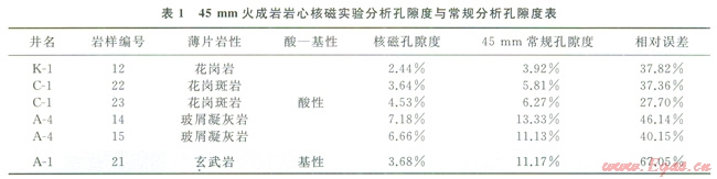 6塊巖心核磁實驗孔隙度與常規(guī)分析孔隙度對比看出,火成巖核磁實驗孔隙度明顯低于常規(guī)分析的孔隙度(表1),并且基性巖(21號巖樣)減小的程度要明顯的大于酸性巖(如表l中的12、22、23號巖樣)。這是因為,基性玄武巖的磁化率高,孔隙內(nèi)部梯度磁場強,核磁信號衰減幅度大。